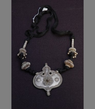 Antica collana e pendente di uso per i rituali del mattino nei templi Indù. Eseguito in fusione di argento a simbologia di Lingam-Sole, inizio 19th secolo, proveniente dall'India nord occidentale.