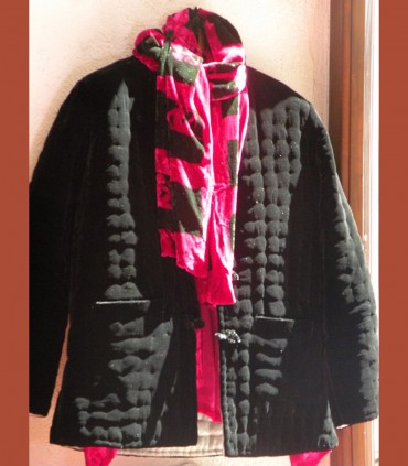 2. Giacca nera imbottita in velluto di seta, foderata in seta, collo coreano, alamari, due tasche.