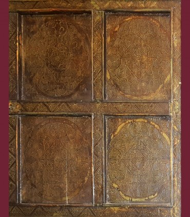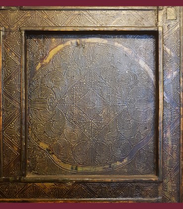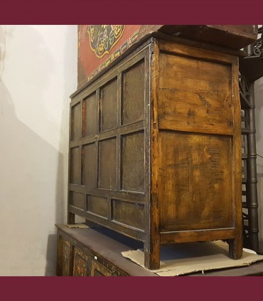 Antico mobile tibetano con simbologia di pipistrelli (bat portafortuna), laccato in oro e decorato in oro.