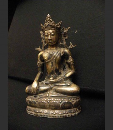 Statuetta di Buddha in bronzo del Tibet, 17th secolo (o anteriore), in buono stato generale di conservazione, eseguito con tecnica di fusione a cera persa in bronzo patinato scuro e successivamente dorato a freddo. La posa sul trono a fior di loto denota le caratteristiche del periodo precedente.