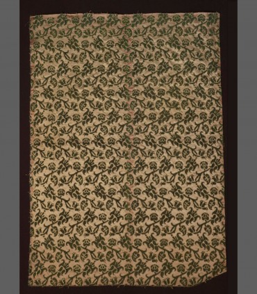 Tessuto realizzato su base di raso di seta colore champagne, eseguito con la tecnica di velluto di seta a più livellli e ricamato con fili d'oro sui bordi.