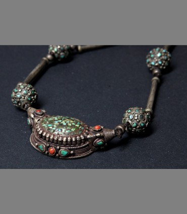 061 - SOLD Tibetan long necklace in silver, turquoise and coral, late 19th century, Gyantse, Tibet.