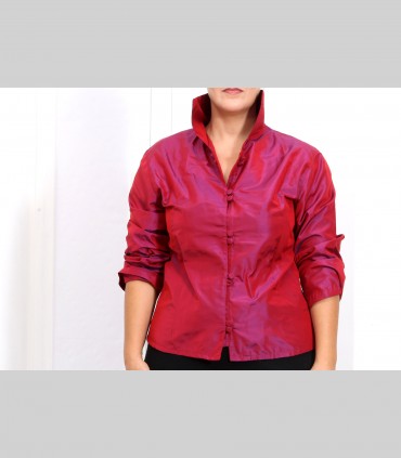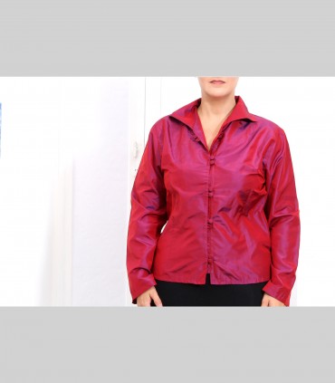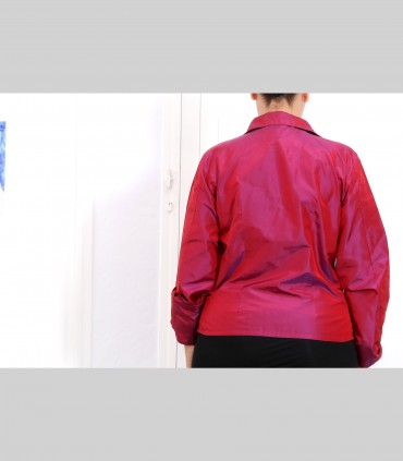 Giacca-Camicia, in taffetà di seta, collo alzato, colore rosso cangiante.