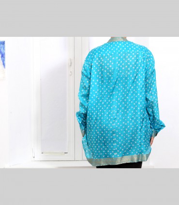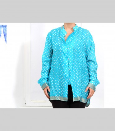 Camicia ampia, seta 21 grammi broccato, tecnica Tie & Dye, collo coreano, colore celeste.