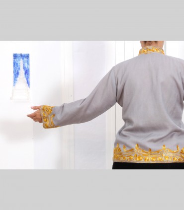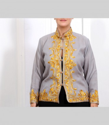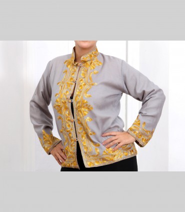 Giacca double face in pura pashmina ricamata, foderata in seta antica, con bottoni foderati, collo coreano.