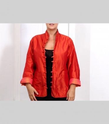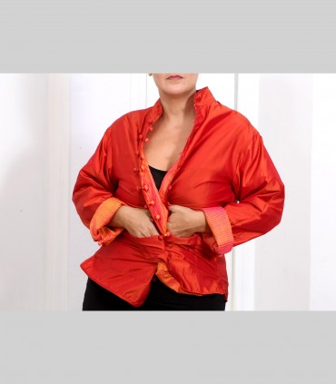 708 - A reversible Jacket in plisse' taffeta silk and darker plain taffetas. The two shades of orange give a warm look on its comfortable wearing style. is also available in various colors and versions doubled with silk velvet.