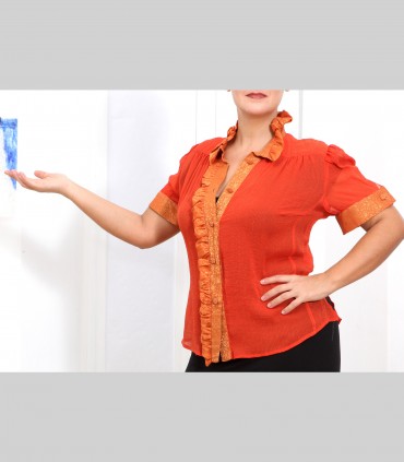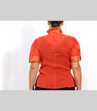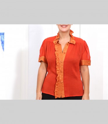 Camicia "Virgola", in chiffon di seta, collo e fronte arricciati, colore arancione, manica corta.