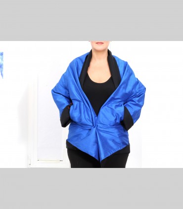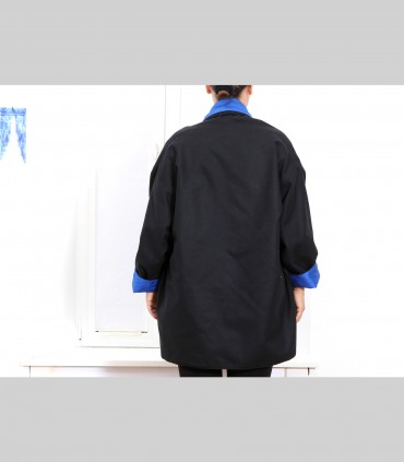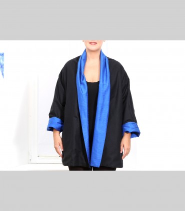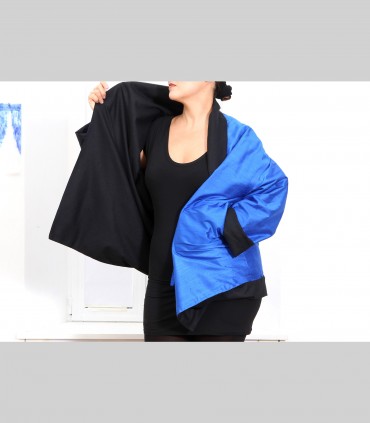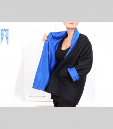 Giacca "kimono" double face,  in panno di pashmina (colore nero) e shantung di seta (colore bluette), collo abbondante.