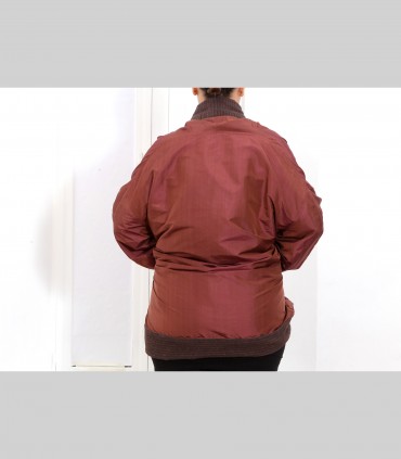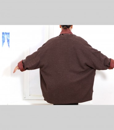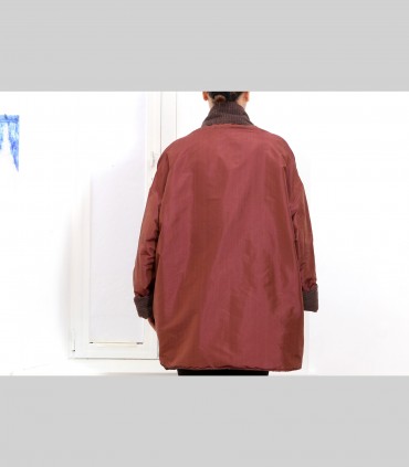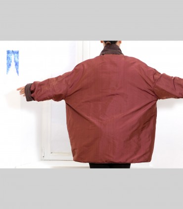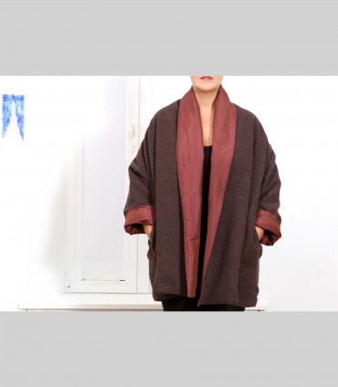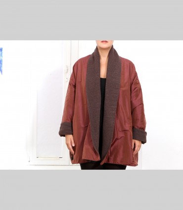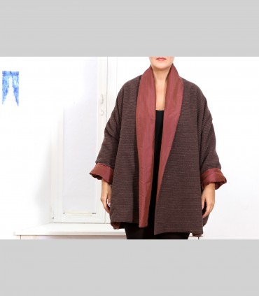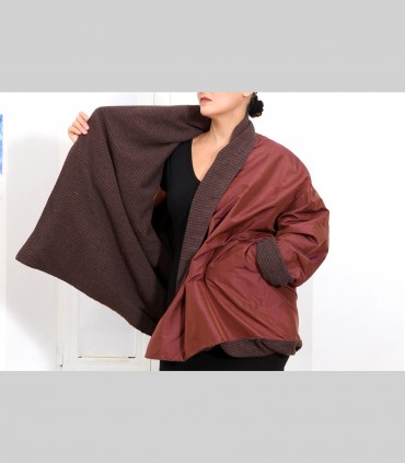 Giacca "kimono" double face, in pashmina bouclé (colore marrone) e taffetà di seta (colore oppio), collo abbondante.