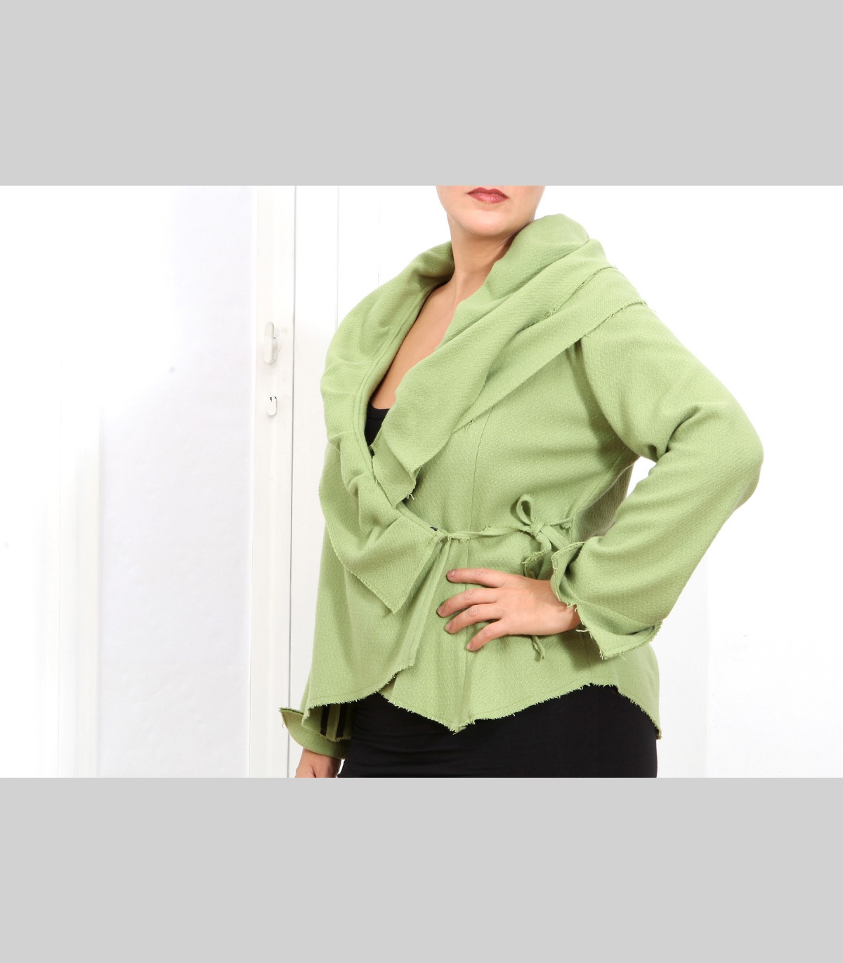 Giacca "Petalo", in pashmina bouclé, modello a incrocio, collo ampio, vestibilità versatile.