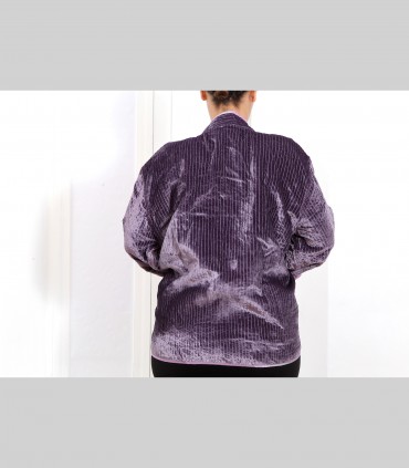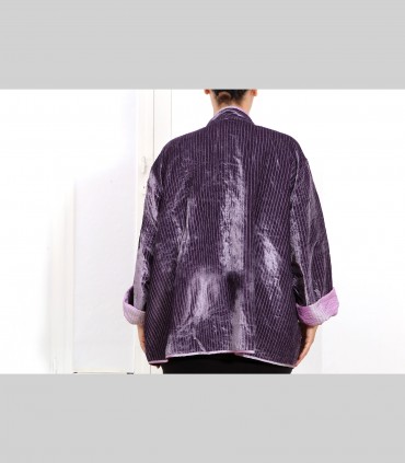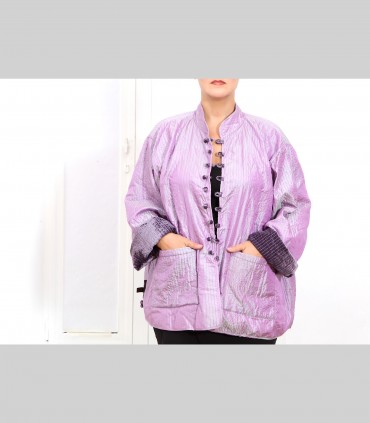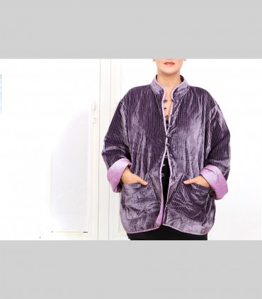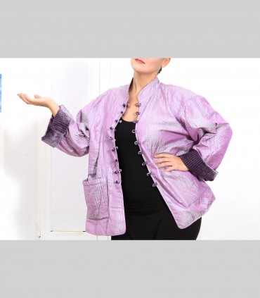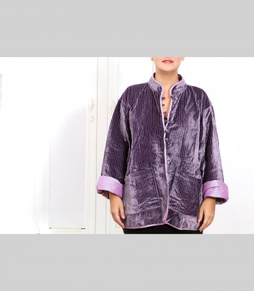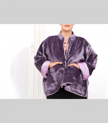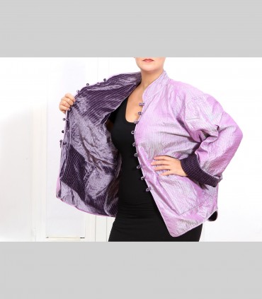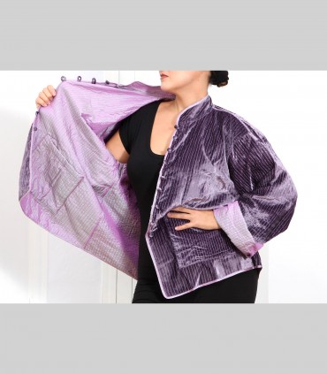 Giacca double face impunturata, in velluto di seta (colore malva) e taffetà di seta (colore lilla), collo coreano, con bottoni foderati e tasche.