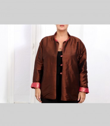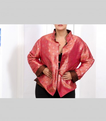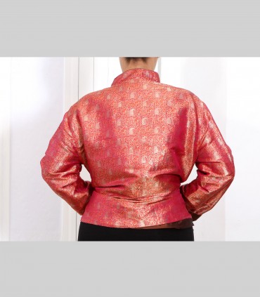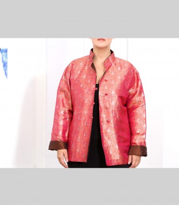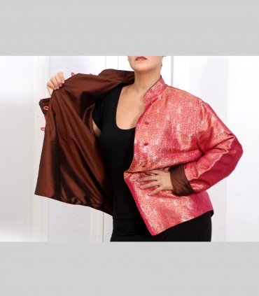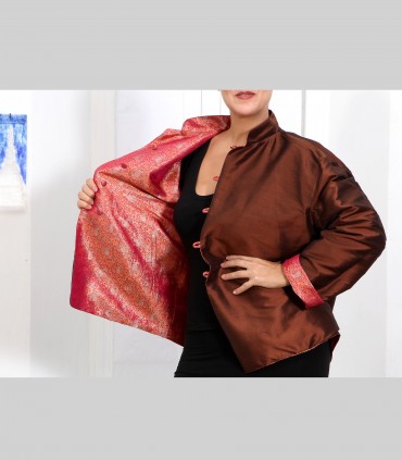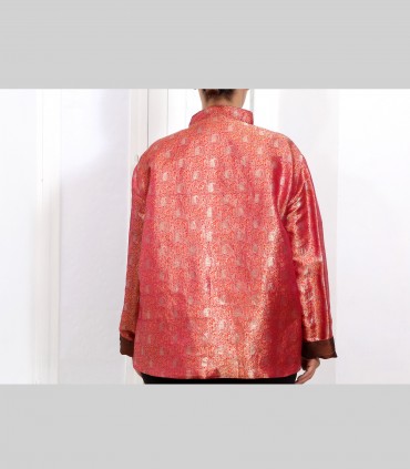 Giacca double face in broccato di seta (colore oro-rosso, disegno a kashmiri) e taffetà di seta a filo ritorto, tecnica di tessitura italiana, collo coreano, con bottoni foderati, vestibilità ampia.