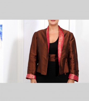 Venduto - Giacca double face "kimono", in broccato di seta (colore rosso) e taffetà di seta (colore oppio).