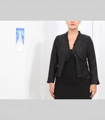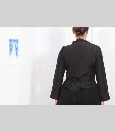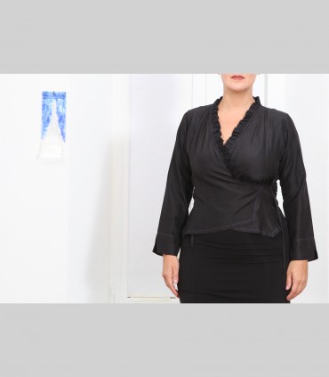 Camicia-giacca incrociata "Petalito", in taffetà di seta, arricciatura bassa del collo, colore nero.