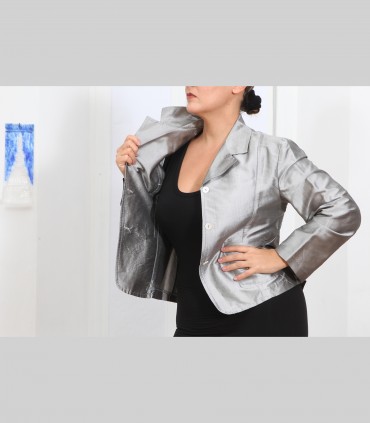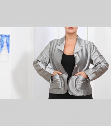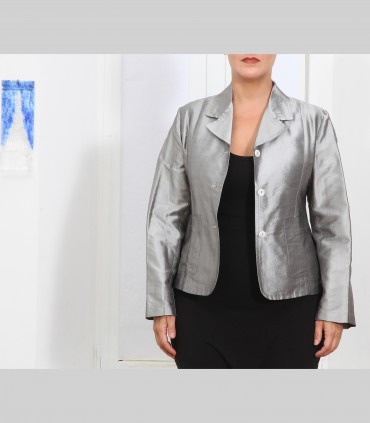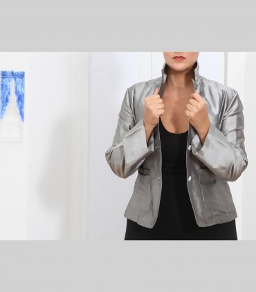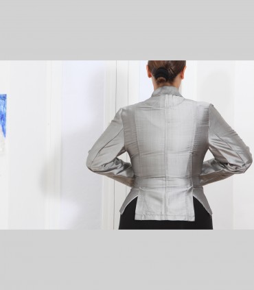 Giacca "Smilza" in taffetà di seta, non foderata, con tasche esterne, con spacchi dietro, colore grigio-argento, vestibilità smilza.