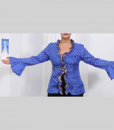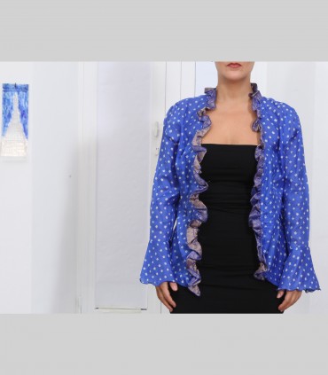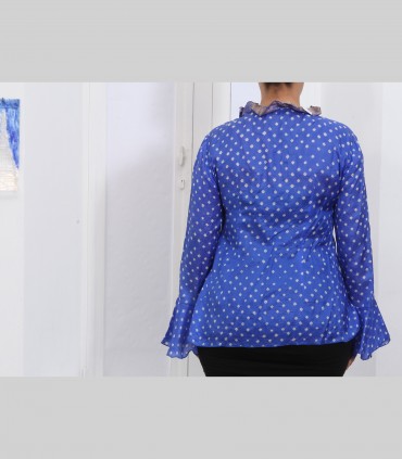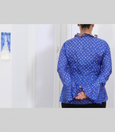 Camicetta-casacca, in seta leggera, manica "a pipistrello", collo arricciato con rouches, tecnica Tie & Dye, colore bluette.