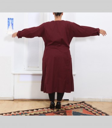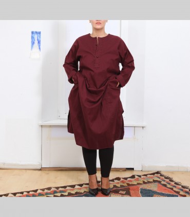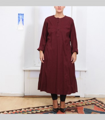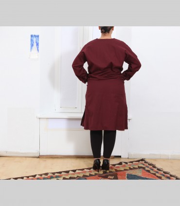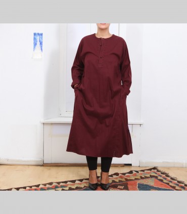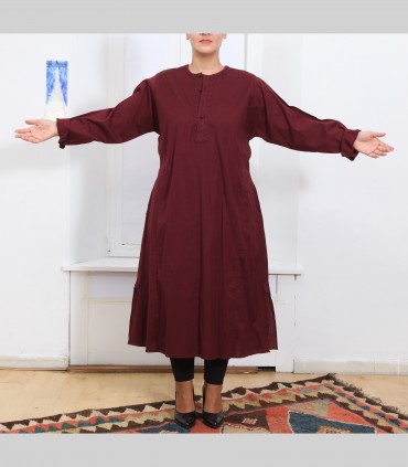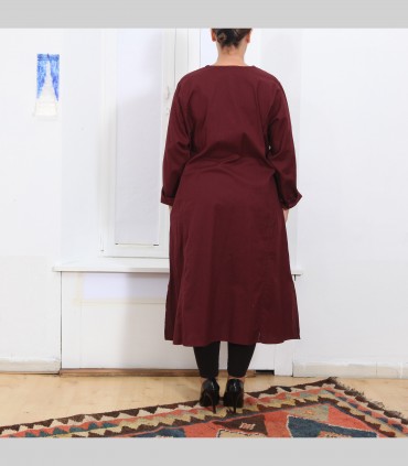 Camicia lunga kurta, in puro cotone, girocollo, con tre bottoni, colore bordeaux, vestibilità ampia.