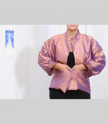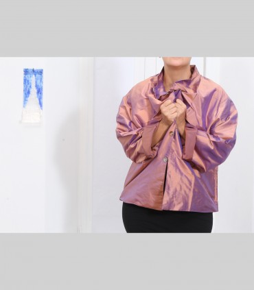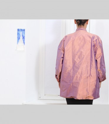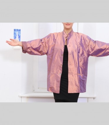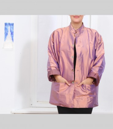 Giacca, in taffetà di seta cangiante, foderata in seta, collo coreano, con bottoni e tasche, vestibilità ampia.