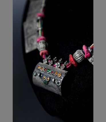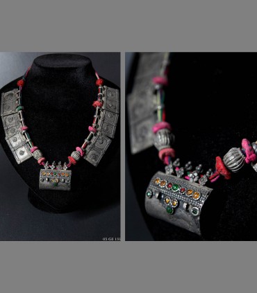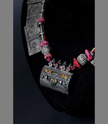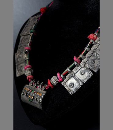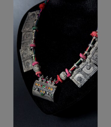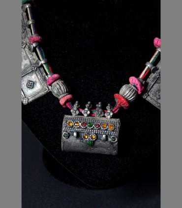 Venduto - Antica collana nuziale dei nomadi dell'area di Pushkar (Rajastan),spesso originata nelle popolazioni Parsi del Gujarat, in argento massiccio a fusione, con porta-preghiera centrale di buon augurio, impreziosita con vetri colorati di alta qualità, a imitazione di gemme preziose. Motivo a ispirazione della serie cosmica, con i dodici pianeti e Sole centrale. Epoca, metà del 19th secolo, India.