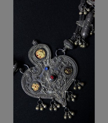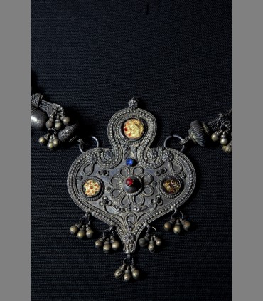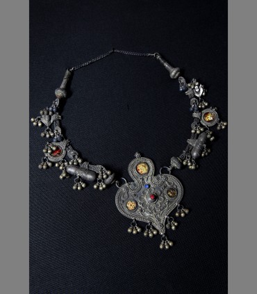 Antica e rara collana nuziale della popolazione di Saba in argento, argento fuso, argento smaltato, d'uso presso i discendenti di Saba, abitanti in area già dal 6th secolo. L'iconografia comprende ispirazioni al Lingam stilizzato al centro, due porta-preghiere laterali e il Sole, all'alba e al tramonto.