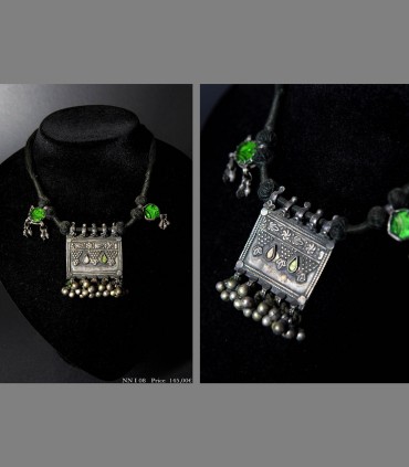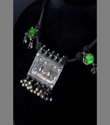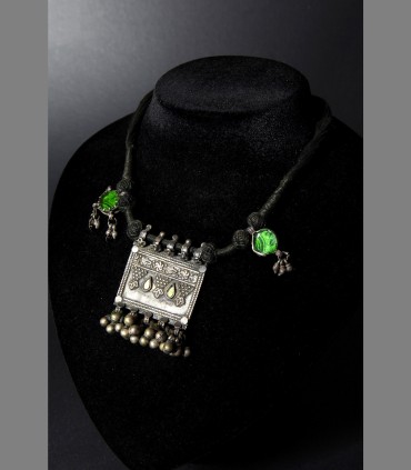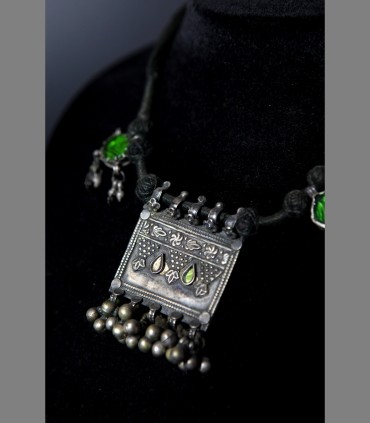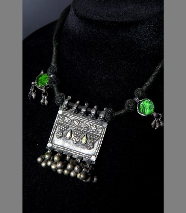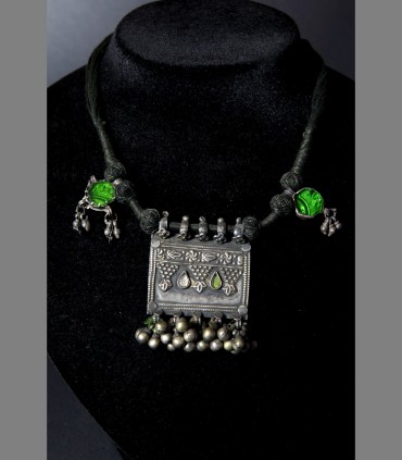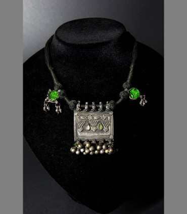 Antica collana delle popolazioni del Gujarat in argento, vetro di Aleppo, composto da un porta-preghiera e due pendenti contro il malocchio, tutto supportato da sonagli.