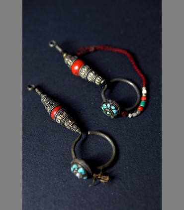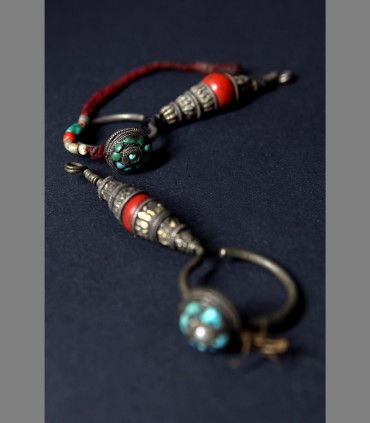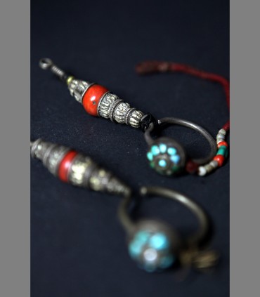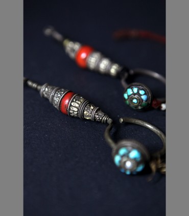 VENDUTO - Antica coppia di orecchini in argento, corallo, turchese e perle di fiume, fine 18th secolo, di uso presso gli uomini della popolazione nomade Kham, Tibet nord orientale.