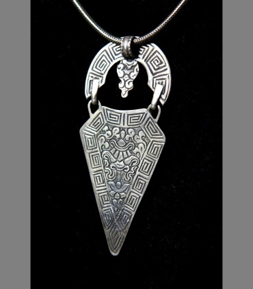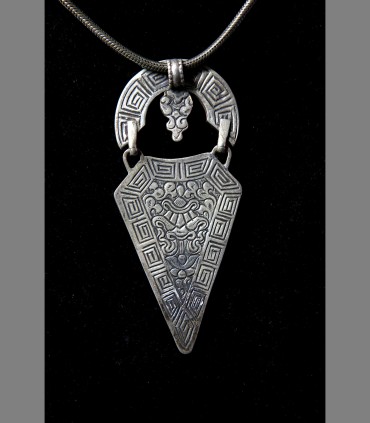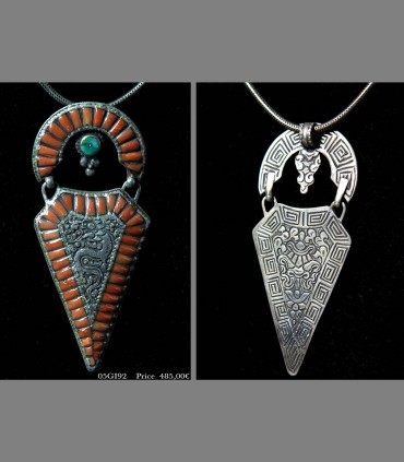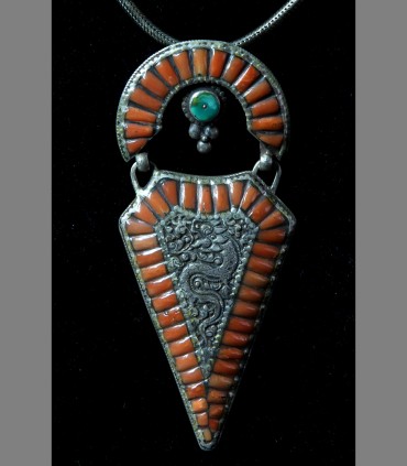 SOLD - A rare talismanic Tibetan Silver pendant, with coral, turquoise, and incised Dragon, late 19th, Central Tibet.