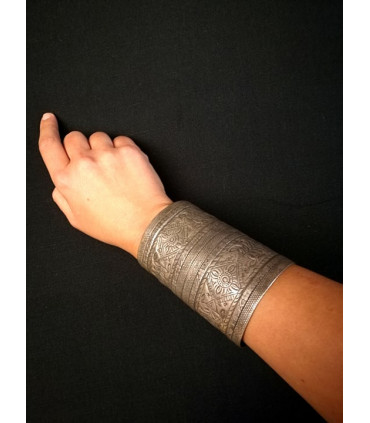 VENDUTO - Antico bracciale in argento eseguito con la tecnica di fusione a cera persa sulla cui superficie sono raffigurati il sole e i quattro elementi della natura dai quali nascono le piante della vita.