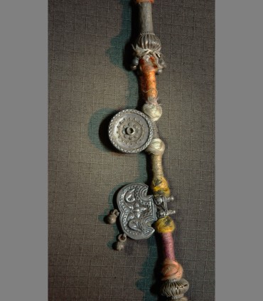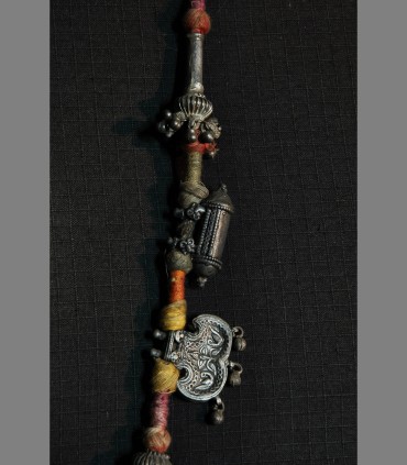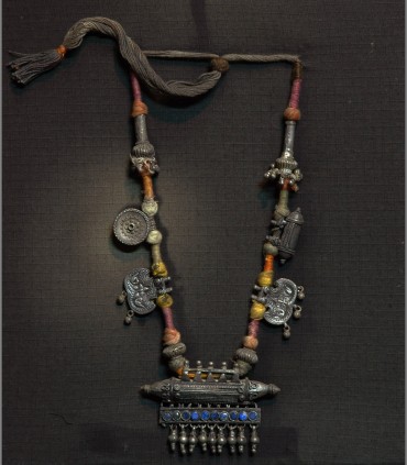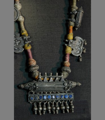 Venduto - Antica collana di rituale Jainista con elementi sacri (porta-preghiera, il Sole, vetri o pietre in lapislazzuli), di uso presso le popolazioni nord orientale dell’India, completano l’ornamento due pendenti con l’iconografia di Uccelli e Albero del Paradiso.